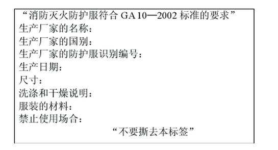 2、查看消防員滅火防護服是否有標(biāo)簽,查看標(biāo)簽內(nèi)容是否符合規(guī)定,每一件防護服應(yīng)有永久性的標(biāo)簽,標(biāo)簽應(yīng)放置在防護上衣前胸左側(cè)的舒適層上,標(biāo)簽上應(yīng)提供圖中所規(guī)定的內(nèi)容。