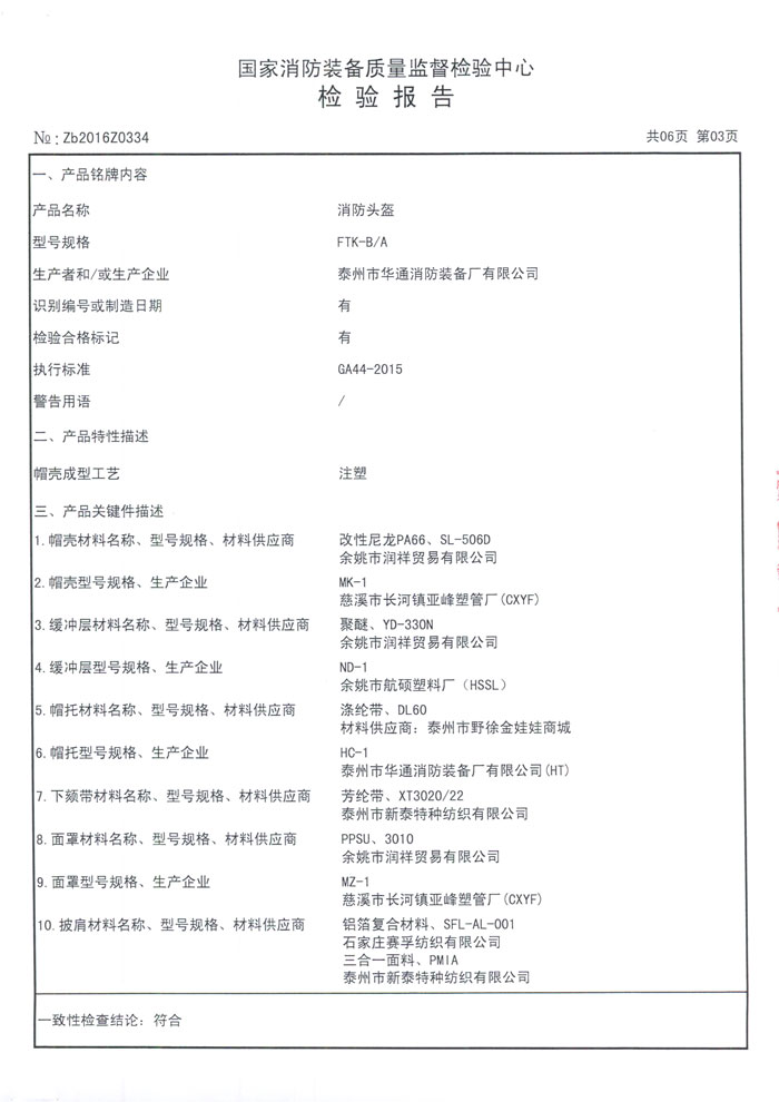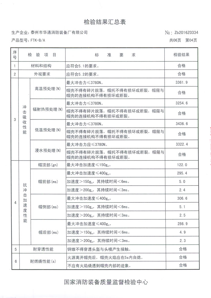 華通消防新型消防頭盔FTK-B/A符合GA44-2015標(biāo)準(zhǔn),CNCA-C18-04:2014《強制性產(chǎn)品認(rèn)證實施規(guī)則 消防裝備產(chǎn)品》,CCCF-XFZB-01《強制性產(chǎn)品認(rèn)證實施細則 消防裝備產(chǎn)品 消防員個人防護裝備產(chǎn)品》。沖擊吸收性能:最大沖擊力≤3780N,帽殼沒有碎片脫落,帽托亦沒有損壞和斷裂,帽箍于帽殼的連接機構(gòu)沒有損壞和斷裂??箾_擊加速度性能:帽頂部最大沖擊加速度≤150gn;帽前部最大沖擊加速度≤400gn;帽側(cè)部最大沖擊加速度≤400gn;帽后部最大沖擊加速度≤400gn。耐燃燒性能在火源離開帽殼后,帽殼火焰在5s內(nèi)自熄,沒有火焰燒透到帽殼內(nèi)部跡象,帽殼沒觸及頭模,且無明顯變形,帽箍、帽托、緩沖層和下頦帶均無明顯變形和損壞,任何部件都無被引燃或融化。